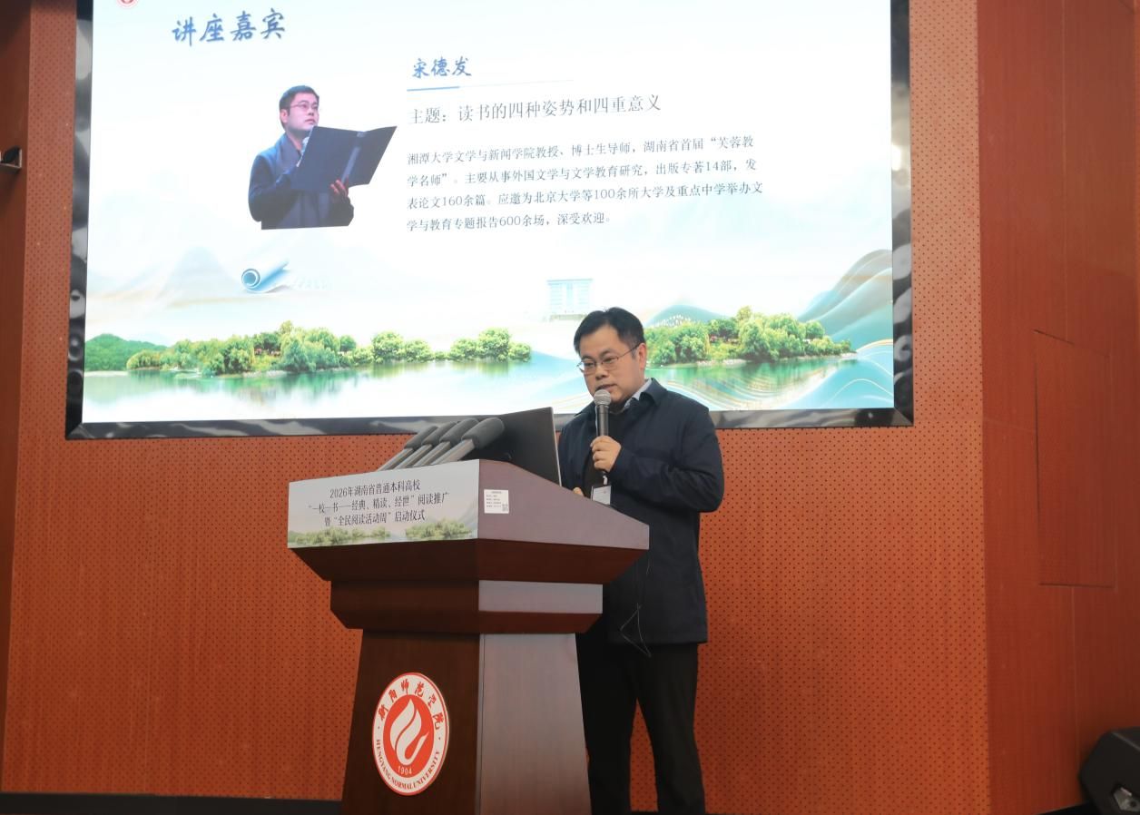 湘潭大学博士生导师宋德发教授的《读书的四种姿势和四重意义》别具慧心,先从容发问“书,究竟该怎么读”,继而娓娓道出 “四姿四境”。四姿者:可正襟危坐以聆听,可斜倚漫读以悦心,可昂首挺立以互照,可安蹲一隅以自适。四境随之递进:一获快乐、二富知识、三升思想、四增智慧。末引亚里士多德“诗比历史更富哲学性”、苏轼“腹有诗书气自华”为证,以“幸福=能力+爱”收束:一个人没有爱,只能叫生存;有了爱,才叫生活。笑声与静思交替蔓延,阅读真谛悄然沁心。