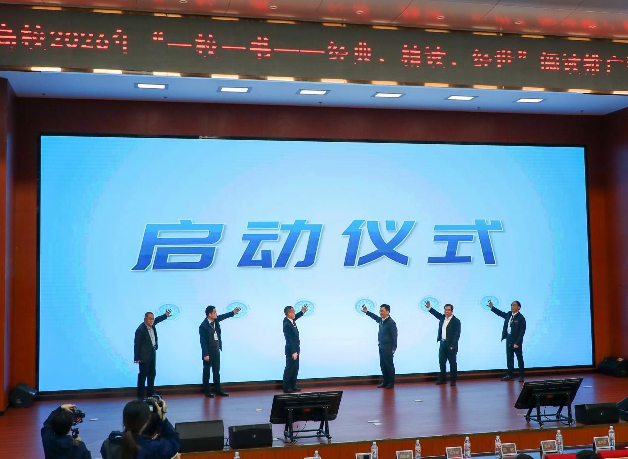 与会领导共同按下启动装置,巨幕上“书润三湘 阅启新程”八字光影闪烁展开,2026年“一校一书”阅读推广活动正式启动。