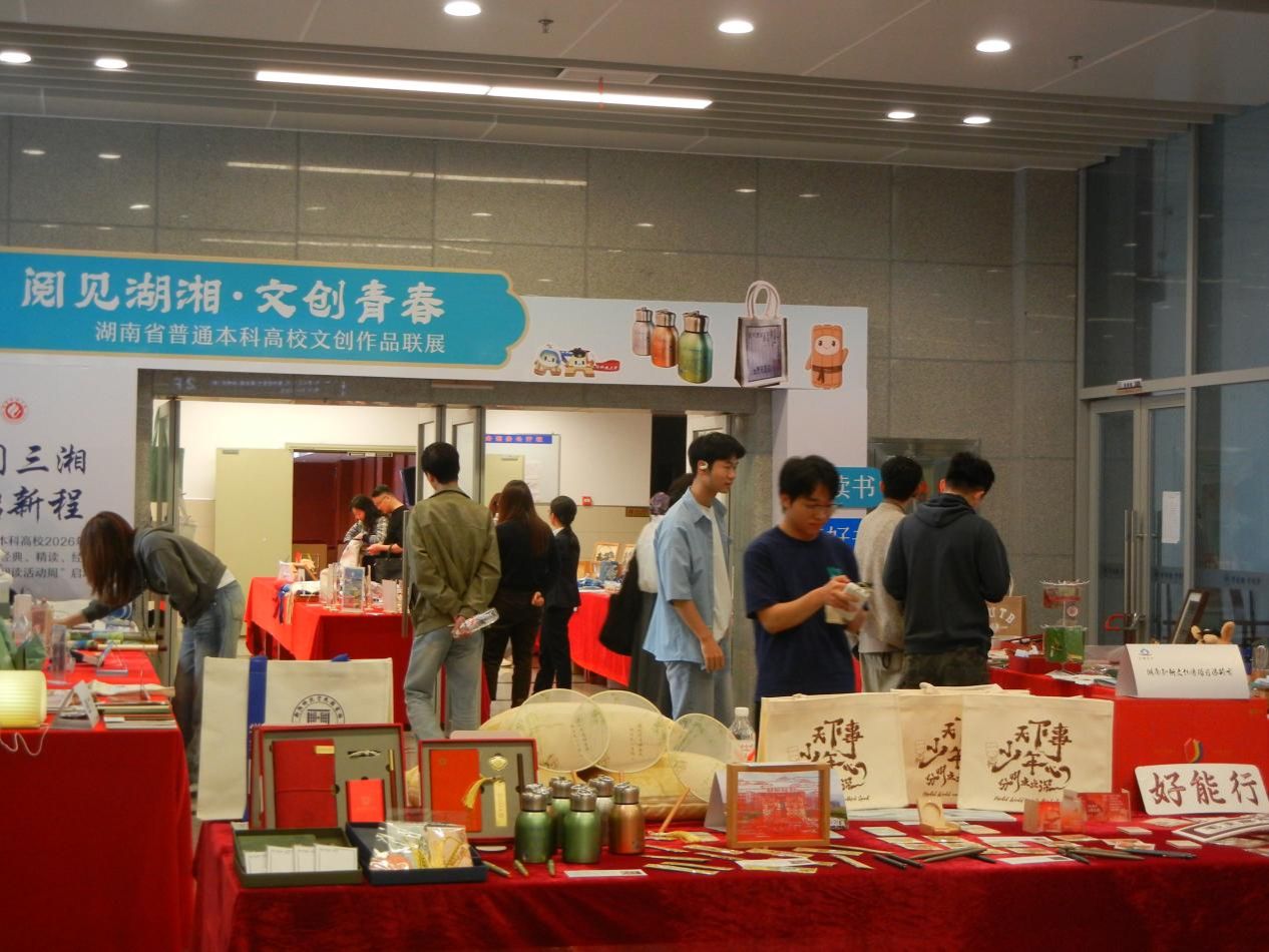 统一规制的展桌依次列阵,校名立牌与设计说明卡清晰可辨。二十二所高校携师生原创力作亮相:校园IP雅物、湖湘特色书签、红色文化手账、数字阅读衍生品——方寸之间,阅读的雅趣与青春的创想凝为一体。