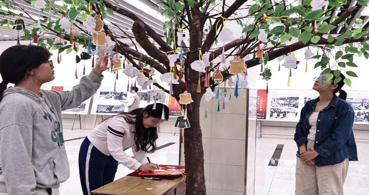 寄语“英雄树”活动里,同学们以笔为桥跨越时空:“吾辈当以青春守护这盛世中华!”一张水壶形状的卡片上,字迹遒劲有力。象征精神传承的“英雄树”挂满了一百多张学子们手写的致敬与承诺,成为图书馆内最动人的风景。